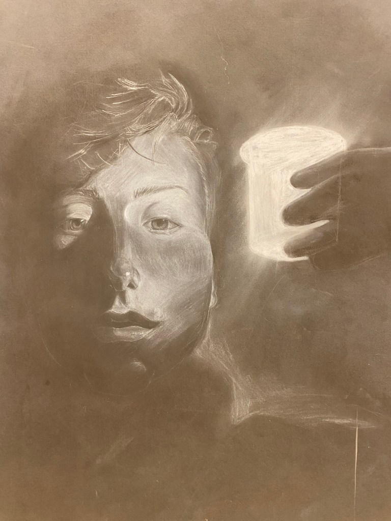 “Most of my pieces have a specific idea/motivation/meaning behind them, but this one was just technical practice as an assignment for studio. The assignment was to use dramatic lighting to create a piece by drawing the negative space on black paper. This was definitely a challenge because typically I’m used to drawing through solid shapes and then adding shadows later, so this was a lot of fun. I chose the candle light just because I thought it looked cool and my motivation was purely fun. I’m happy with the way it came out because I definitely did have fun making it,” said Minch.