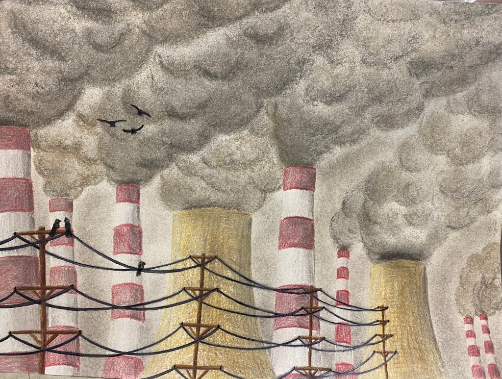 “Basically, my premise for my sustained investigation was climate change and its effects on the environment. This is the first in the series. What I wanted to show in the drawing was how revolting pollution is and how it takes over the world. In this picture, there are only a few birds sitting on the power line and some flying away to represent how animals are affected by it,” said Kauke.