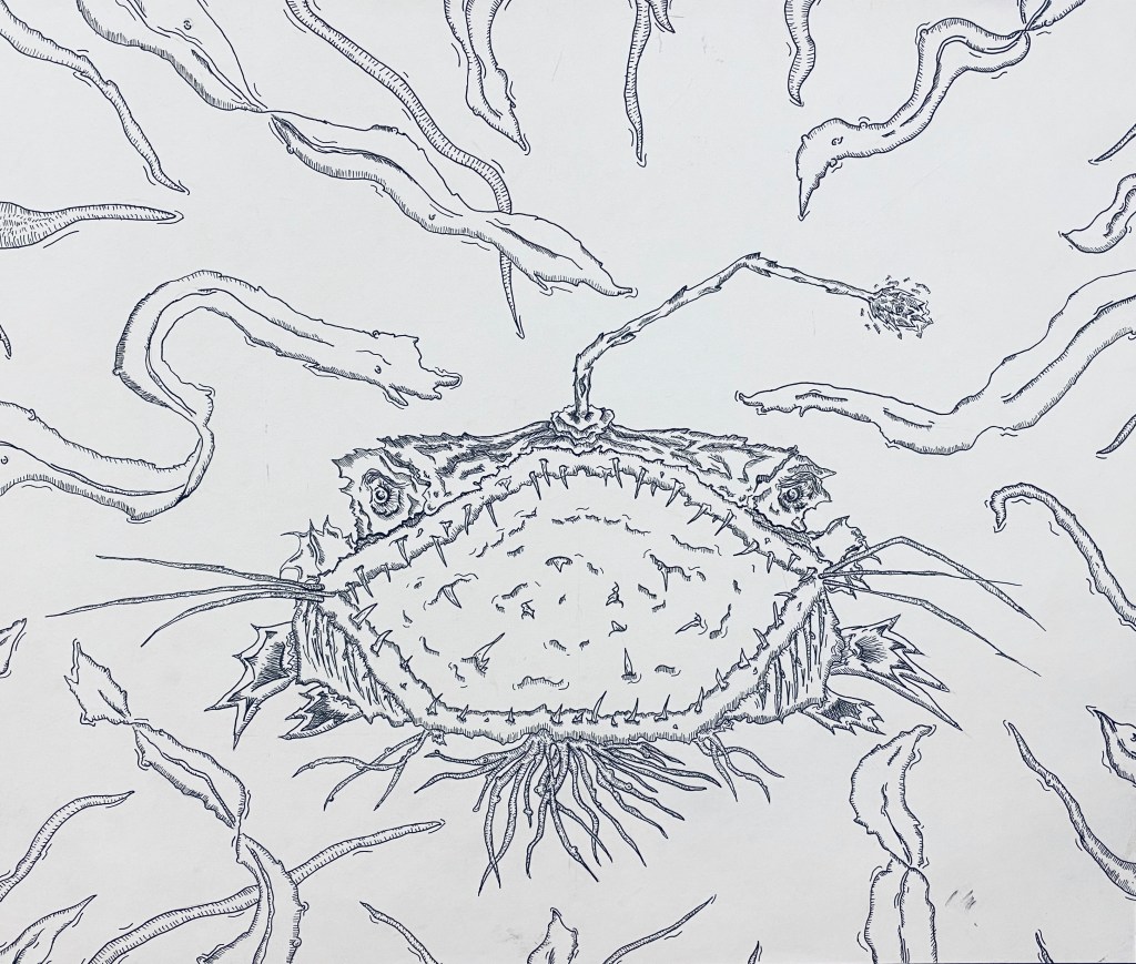 “So that piece obviously is an anglerfish while the seaweed is encasing it. To me, the seaweed represents anxiety, depression and things that we as humans get caught up in everyday life, especially now. All while the anglerfish is sitting in the middle of all that. It may seem gross and scary looking, but it sheds its light in total darkness. The light represents that good that can come when things may seem dark and scary because sometimes we find our best path even when we can’t see it. While being entangled in everyday life there will always be a ‘light at the end of the tunnel,’” said Kubik.