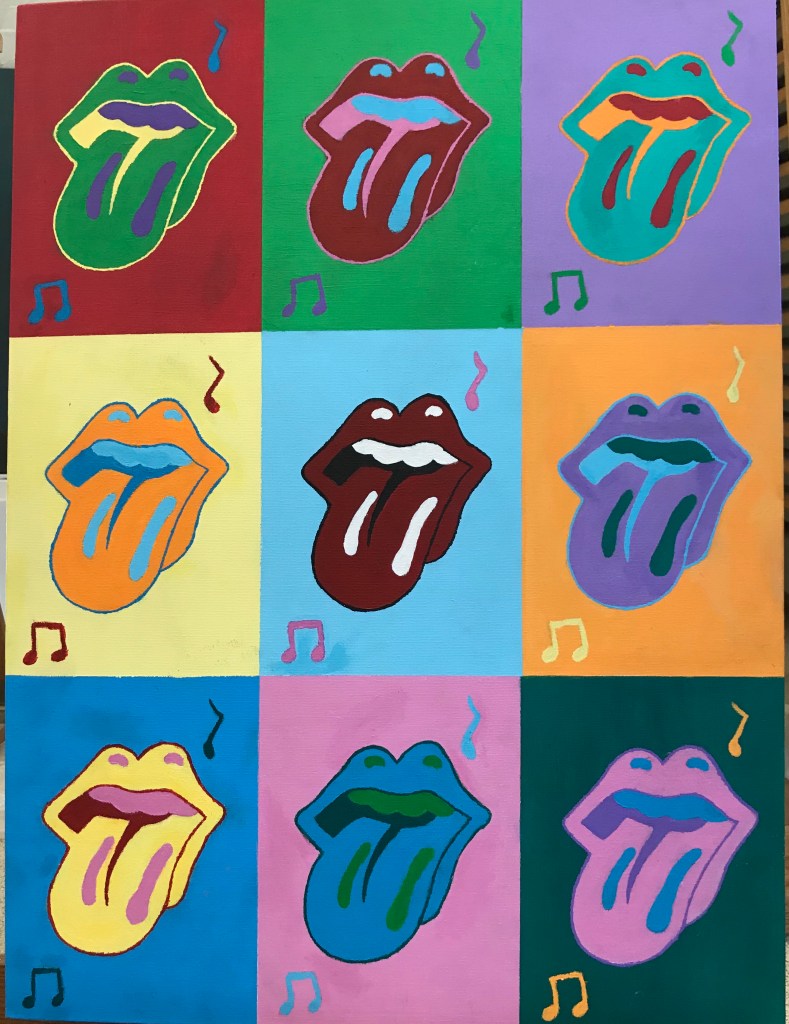 “So this piece is interesting because the whole idea started from it being an Andy Warhol inspired piece,” explained Liz. “He is known for doing Pop Art, with one image from pop culture and repeating it using multiple bright colors that all differ to create this almost abstract, realistic piece. Pop Art always was a subfield in art that appealed to me with its bright colors and unique take on pop culture, so this project was one I was very excited about. I knew right away that I wanted to use the iconic logo for The Rolling Stones. I picked this logo not only because it was such a recognizable one, but it also holds a special place in my heart. I love older music. When I was young my parents introduced me to all the music they listened to from the 60s to the 80s, and I absolutely loved it. I always listen to music from the 50s all the way to the 80s, either with my friends, my parents or just alone in my room. The thing about pop culture is that there is a very cookie-cutter view about society. Everything has to look a certain way in order for it to be popular. This art style sort of breaks that stereotype: everyone can recognize The Rolling Stones symbol with or without the classic red, black and white colors. Individuality can inspire pop culture, and being unique and yourself is what makes you stand out. The Rolling Stones, through their music, also talked about breaking away from stereotypes and being their own band that cared about the music they created and the people they inspired. This whole piece was inspired by the idea that Pop Art challenges “fine art” and blurs the boundaries of high art and low culture. There should be no hierarchy of culture or art. Inspiration can be drawn from anything in the world around you, it is just your decision to make something else into your own.”