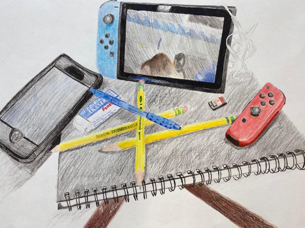 “This piece represents a few of the things that I value and conveys my interests, with the pencils and sketchbook representing my love for drawing, the technology showing my love for video games and the internet and the headphones reflecting my very unique taste of music. Without these items, and what they represent, I would not be the person I am today,” said Cummings.