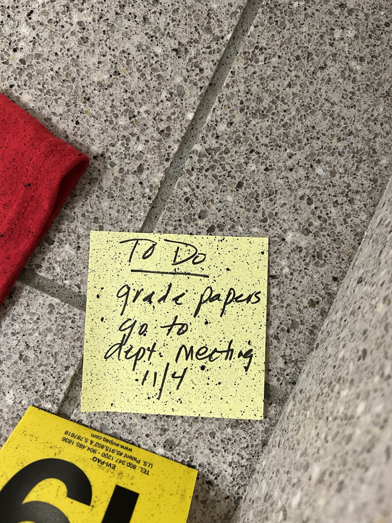 “Left at the crime scene were two sticky notes, one saying ‘Meeting E109’ and the other ‘To Do: Grade papers, go to department meeting 11/4,’” Forensics student Cece Tobin explained.