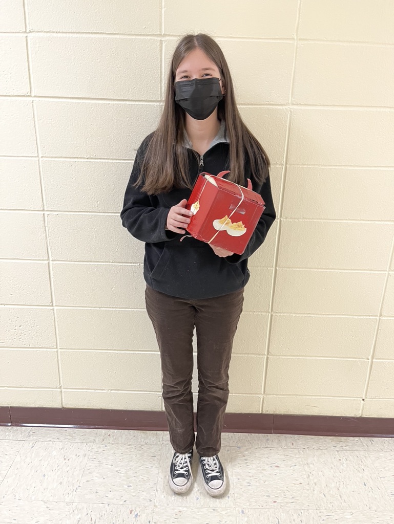 “I chose to design my carrier as a deviled egg because I wanted to make it egg themed and I enjoy deviled eggs. To design the outside, I duct taped the outside of a cardboard box and added pictures of deviled eggs on the front. I even gave my box devil horns and a tail to really make it look like a devil.”