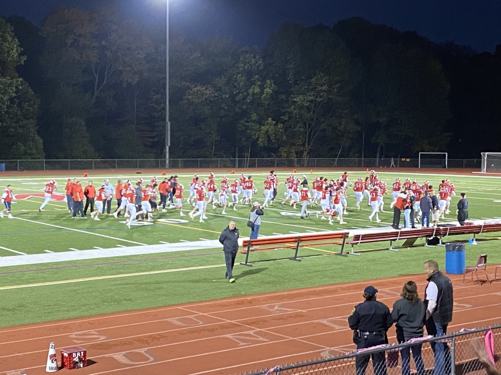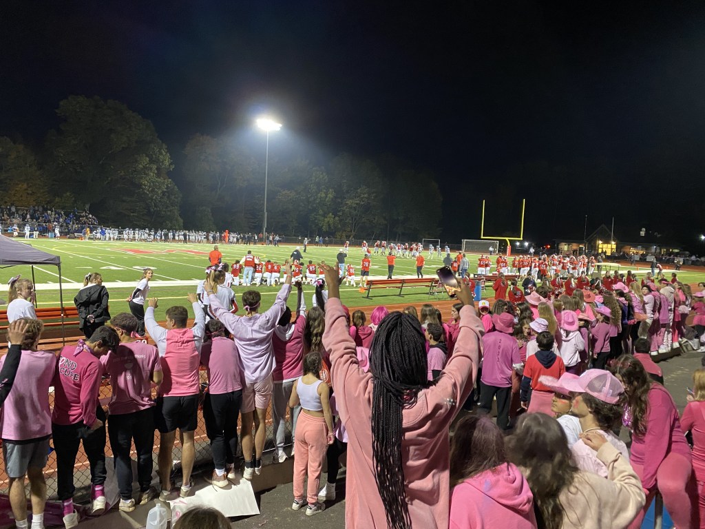 This important game was a great match with an extremely important cause. The theme for this game was a pink-out, and people came dressed in pink outfits with pink accessories. The Red Army also organized throwing colored chalk into the air, and helped with many cheers that improved the game’s environment. Giordano comments, “The support from the community, from the school, the student body, has been amazing- better than in all the years I’ve coached. This is probably the most active I’ve seen the student body.” He also adds, “The Red Army helps make that atmosphere, so we appreciate them.” In addition to this, a ceremony was hosted for the Briganti family, who was affected by pancreatic cancer, before the football game. Players were seen wearing purple wristbands to show their support, and t-shirts were also being sold to promote pancreatic cancer awareness.