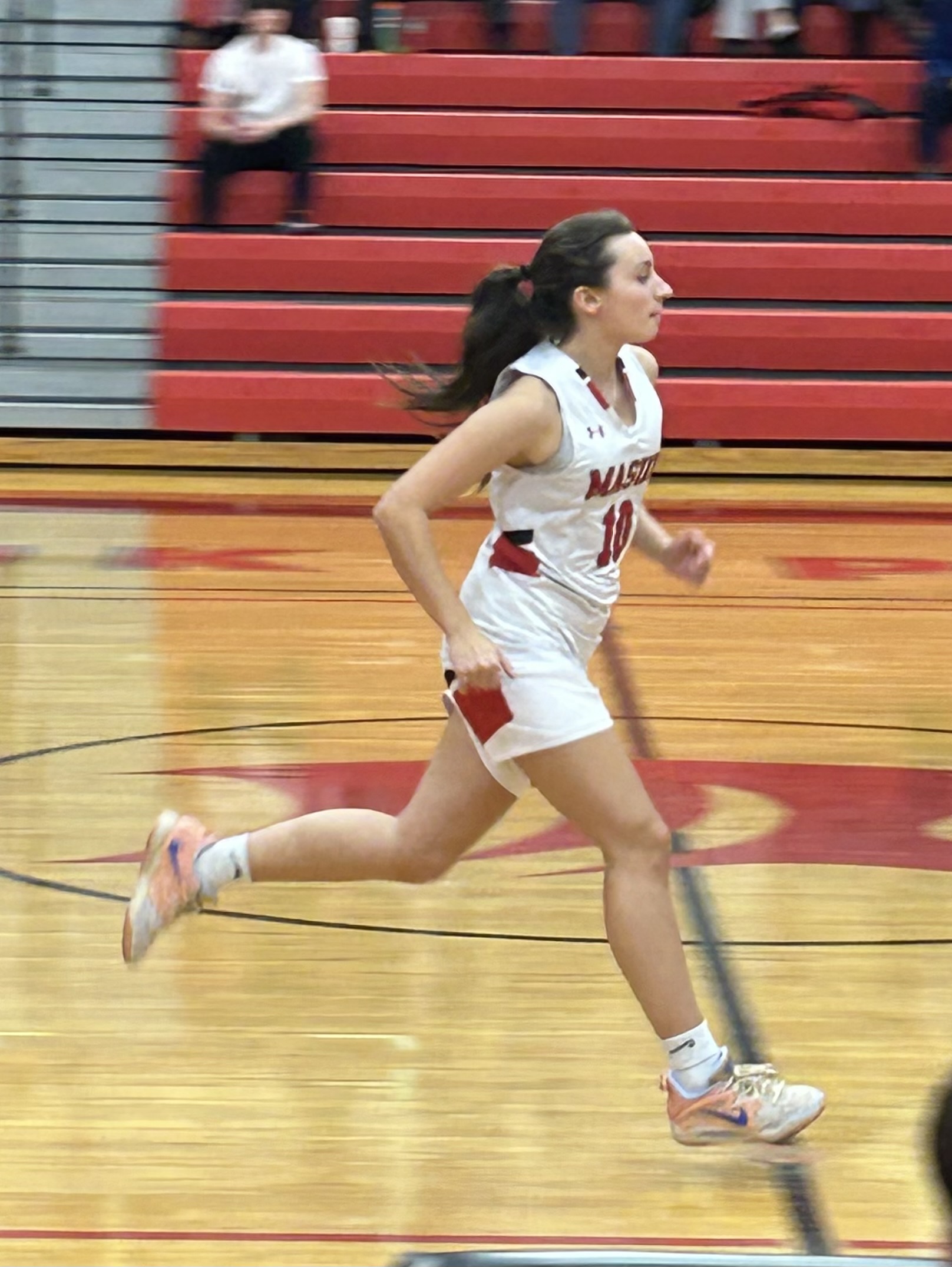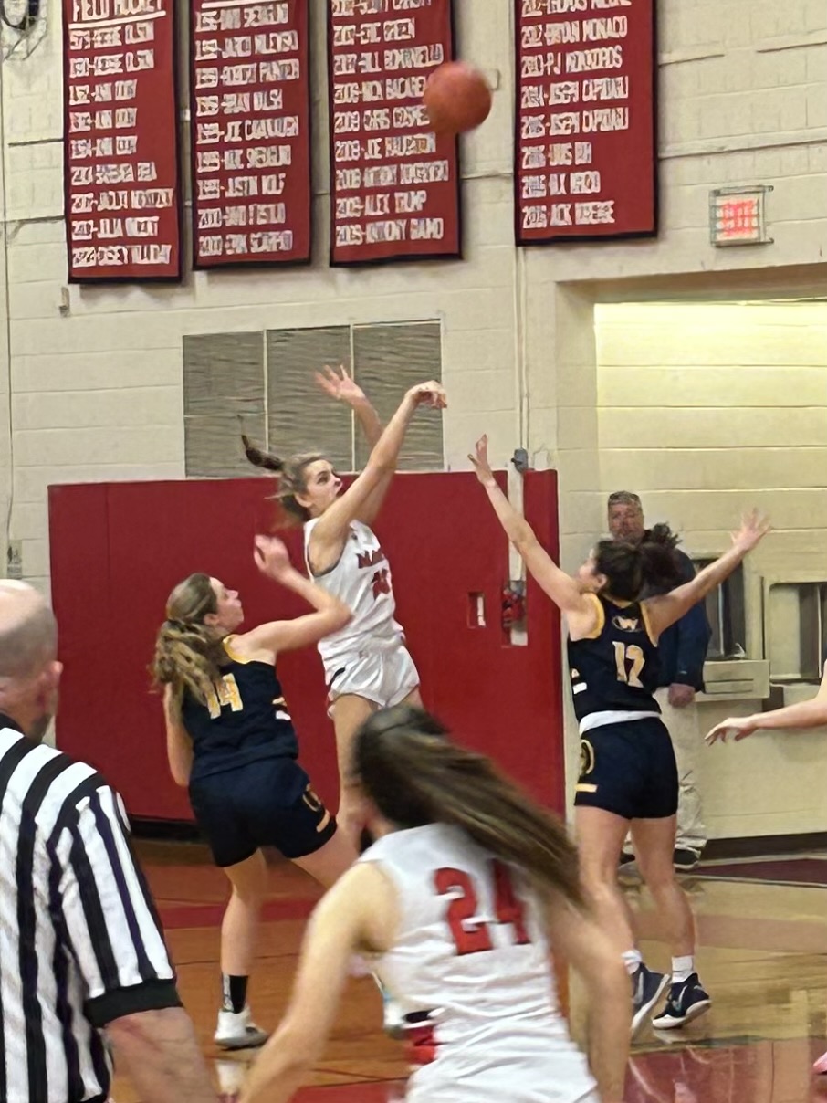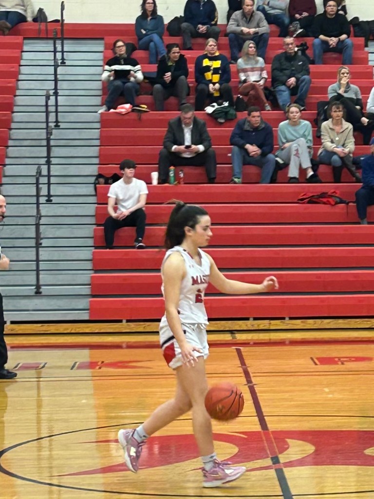 The team started off the game with lots of ball movement between players, allowing Bailey Bajda to get past the competition and make a basket. “We had very good ball movement and off-ball movement on offense,” commented Lauren Breyan. The girls continued with their rapid passing and shot attempts, with Bajda scoring two more two-point baskets, and Sofia Lieto scoring a third basket. After fluid passing between Sofia Lieto, Jenna Smith, and Maya Ventresca, the team scored another two baskets, one from Sofia Lieto and one from Smith. In the last seconds of the first quarter, Ventresca scored another basket for Masuk, Bringing the score at the end of quarter one to 14-4.