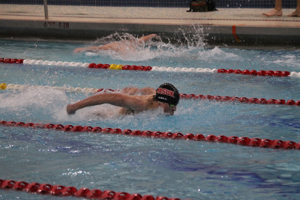 The team continued with their first-second finishes in the 100-yard backstroke where Hall won with a time of 1:01.86, and Will Hardy followed in second place with a time of 1:08.68.