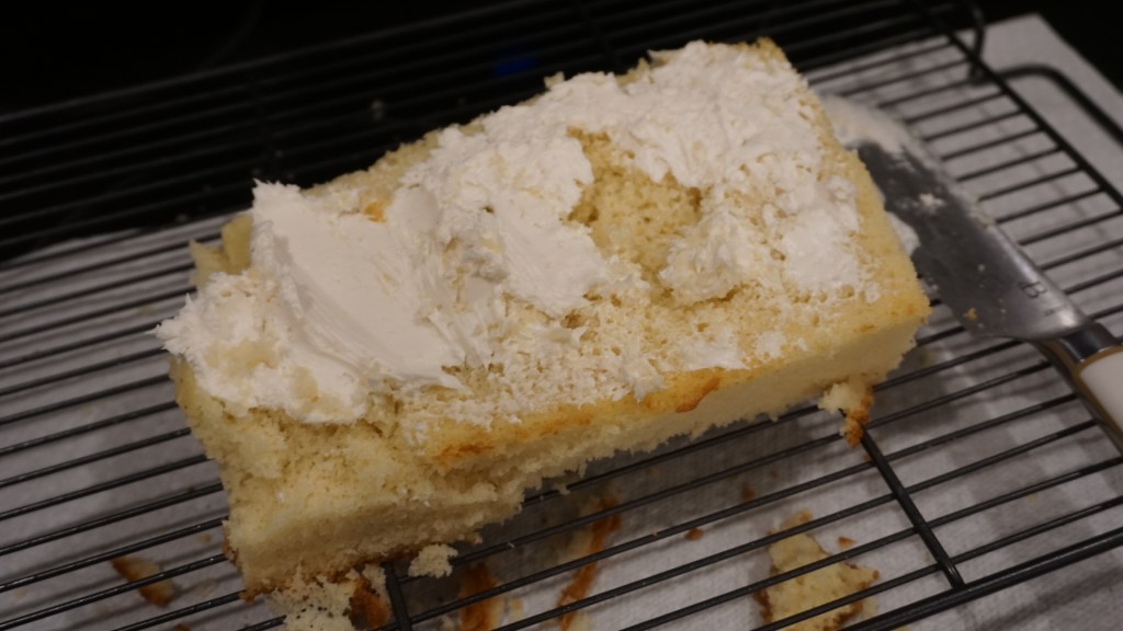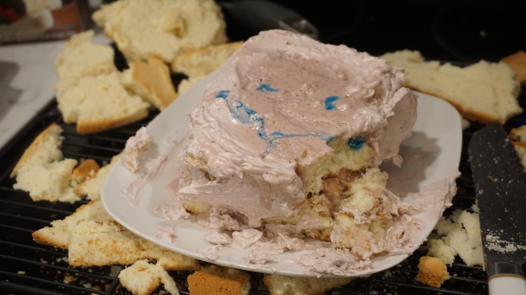 Overestimating my skills again, I cut off the crust and began decorating it with premade icing. As I spread my icing onto the cake, the cake went along with it. The icing didn’t stick and almost made my cake crumble into large pieces. I gave up and ended up with a barely frosted uni-layered cake with pieces falling off.