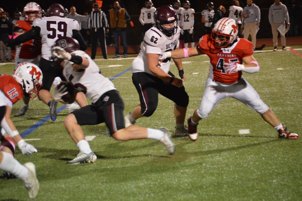 Masuk started with a bang, as a tremendous opening kickoff return from Shane Walker (you’ll hear his name a lot) put the Panthers in position for their first of six scores of the night. The opening drive capped off with quarterback Aaron Champagne running for a touchdown from twenty-two yards out. Although Masuk suffered multiple false start flags early on, they turned the spirit around, shutting out Bethel the whole game, forcing all kinds of pressure and turnovers, demonstrating their ability to turn around the flags and force massive mistakes and miscalculations on Bethel’s side.