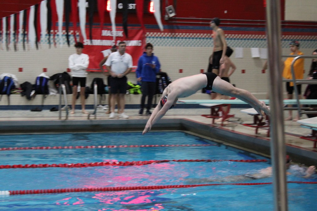 “They have a lot of good kids on the team, probably about five,” said Kirberger. “But if we perform well, surpass expectations, I think we’re going to win this meet.” While Masuk came out with an early lead of 41-17 in the first few events, they began to struggle with New Fairfield coming out on top in the 100 Yard Butterfly. But, Masuk managed to secure second and third. Eanotti finished with a time of 58.75 and McHugh clocked in at 1:00.10. The 100 Yard Freestyle saw similar results, with New Fairfield again taking first, while Masuk filled the second through fourth spots: Julian with 1:04.36, Pierson with 1:07.39, and junior Aidan Cammarano with 1:10.16.