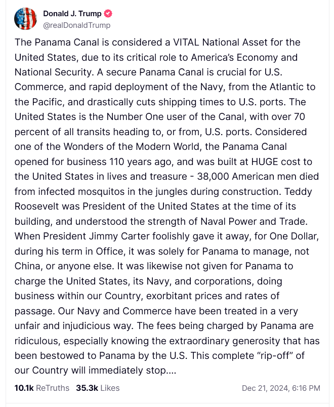 Similarly to his Greenlandic ambitions, Trump has expressed interest in reclaiming the Panama Canal from the Central American nation of Panama. In December of last year, Trump expressed anger at the “unfair and injudicious way” that Panama was treating U.S. ships (referring to the rates that vessels are charged when crossing the canal). He pushed the issue throughout December, even centering his Christmas Truth Social post around it.