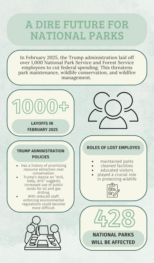 Trump has made it no secret that he wants to “drill, baby, drill,” meaning he wants to utilize U.S. federal lands for the extraction of natural resources. This mass layoff makes national parks even more vulnerable, as they are owned and managed by the federal government. Trump already has backed an anti-environmental agenda in his first term by withdrawing from the Paris Agreement, an international treaty that aims to reduce greenhouse gas emissions and slow climate change. So, it is unclear what his plans are for these national parks.