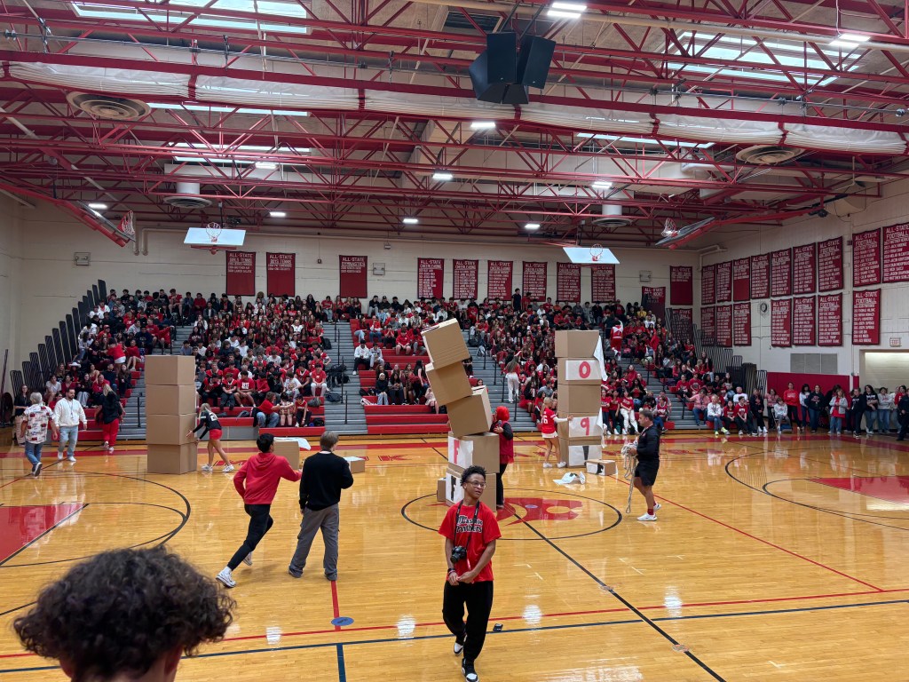 Each class was given a stack of six boxes that had the Masuk symbol, their class’s year, and an exclamation point. The staff was also given the same number of boxes. After this year’s Red Army leaders knocked down the tall stack, the rules were explained. Whichever team stacks the boxes up as they originally were first wins. Once they were told to start, they all rushed to begin stacking. The freshmen class was looking to be the winner for the majority of the time, coming so close, but the senior class beat them before they were able to finish their stack, thus crowning Carter Adranga, Jaylen Africot, Izaiah Caldwell, Kara Leandres, Abigail Yeager, and Emily Poole the winners.