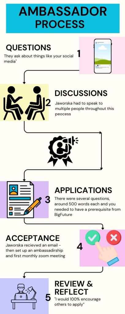 Jaworska has already begun fitting into her ambassador role nicely. Few students understand Big Future resources, and she can aid in that. There are many tools which is essential for the college planning process. Her appointment as ambassador came at a crucial time due to the fact that the college process is in peak time right now, and many might need help. For example, having someone to give resources and reassurance. It is great to have a student representative who can help so that all students can reach their goals, regardless of whether guidance is already busy. In this program, the ambassadors are rewarded for their work in shares.