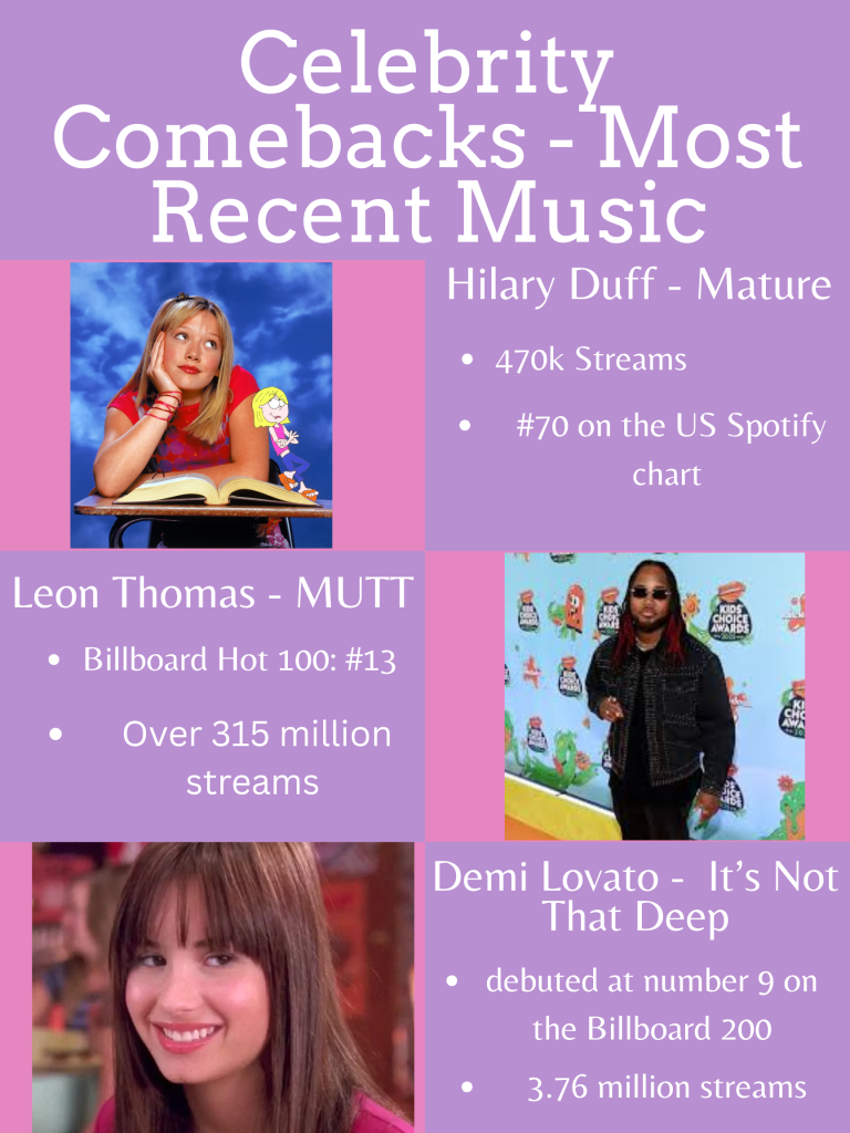 This recent wave of comebacks displays that stepping away from the spotlight does not mean fading. Artists like Hilary Duff, Leon Thomas and Demi Lovato have proven that reinventing and developing as artists is crucial to the success of their careers, as they step out of their Disney and Nickelodeon shells and into the music industry. These comebacks remind audiences – especially seniors – that the stars they watched growing up are still growing with them, throwing a wave of nostalgia and a bittersweet feeling as they near the end of their childhood. Just as the stars are discovering new beginnings, so are the fans who grew up with them.